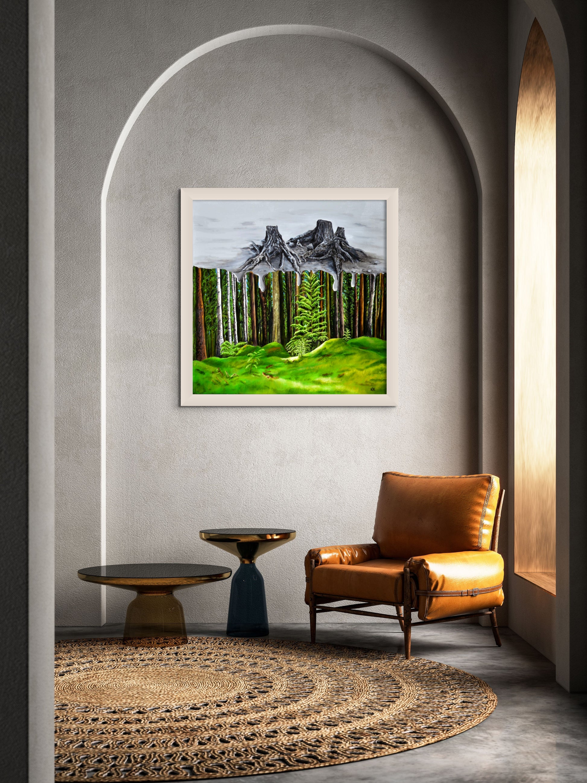 Cette huile sur toile met en lumière le contraste saisissant entre la beauté enchanteresse des forêts et l'horreur dévastatrice de la déforestation. À travers cette composition l'artiste explore la richesse de la biodiversité, le respect de l'environnement et la lutte essentielle contre le réchauffement climatique.
