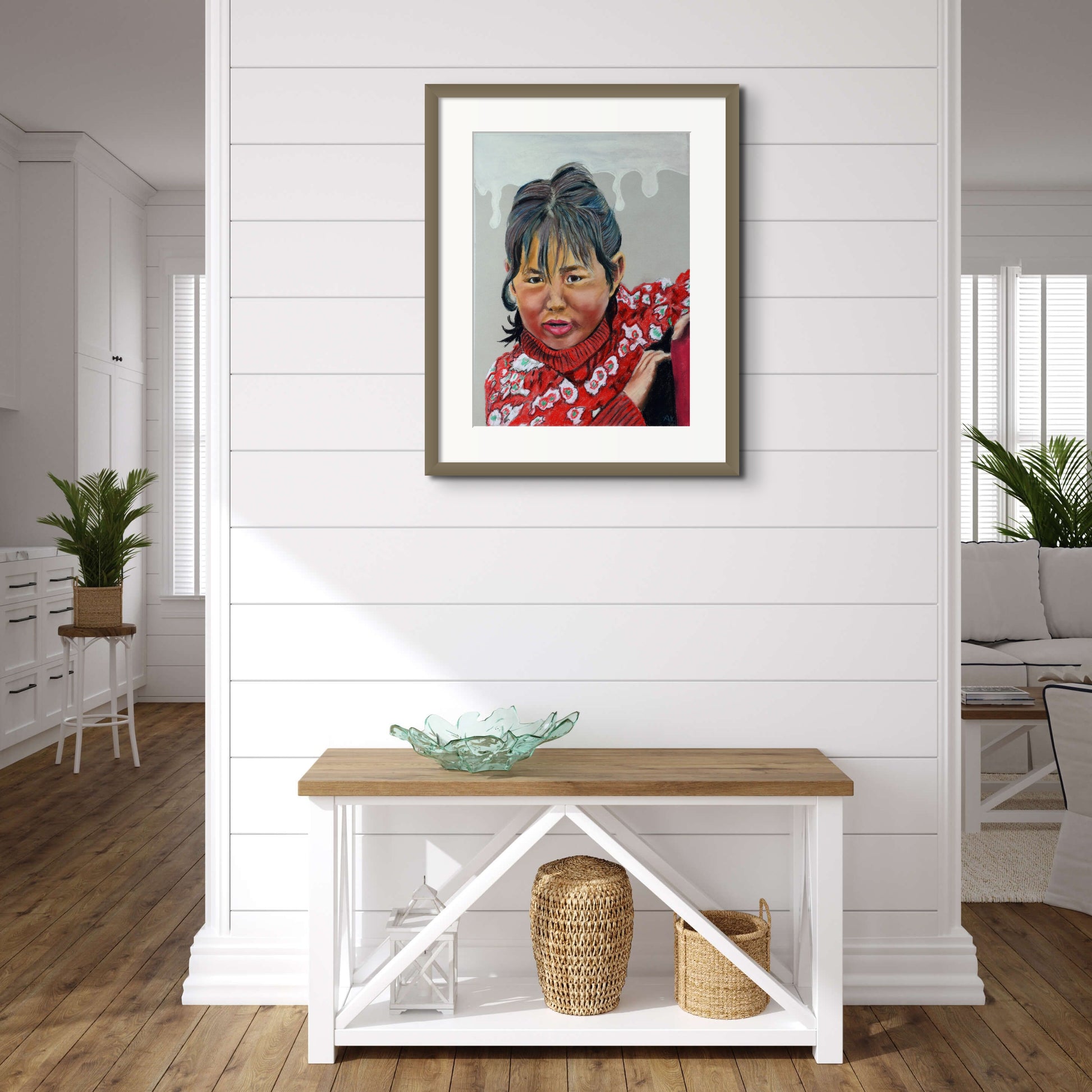 Ce pastel capture le visage d'un enfant inuit face aux bouleversements climatiques et environnementaux qui menacent son mode de vie ancestral. Il illustre la réalité poignante des communautés inuites confrontées aux conséquences du réchauffement climatique et de la pollution des océans.
