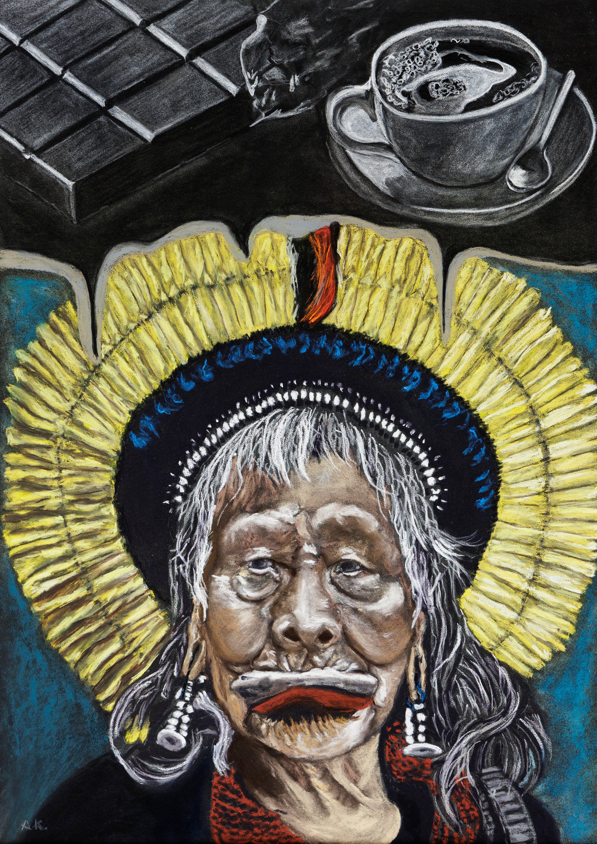 Ce pastel présente un portrait saisissant du chef Raoni Metuktire, figure emblématique de la lutte pour la préservation de la forêt amazonienne. À travers cette composition riche en détails et en émotions, l'artiste met en lumière le combat incessant de Raoni contre la déforestation dévastatrice qui menace l'Amazonie.